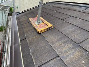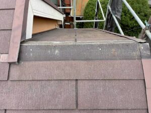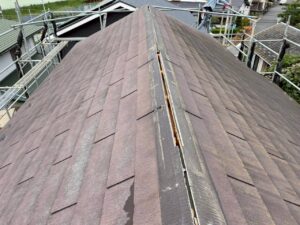 雨水が入りこむため、そこを覆いかぶさるように棟板金を設置するのですが、こちらの住宅ではその棟板金の固定が緩んでおり、外れてしまっていました。