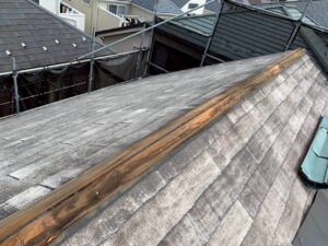 現地で確認させていただくと、色あせがひどく、棟板金部分も経年劣化が進んでいる状態でした。