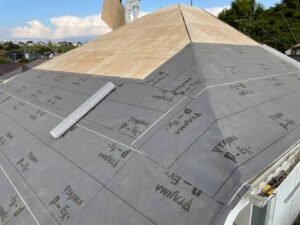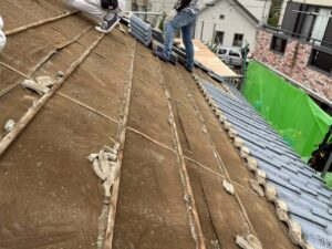 すでに雨漏りが発生していましたので、「葺き替え工事」で瓦を撤去したうえで、新しく屋根材を設置していきます。