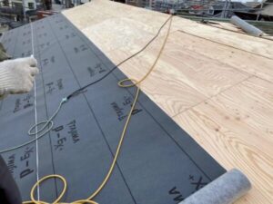 ルーフィングを敷きこむ工程です。