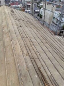 ルーフィングを含めて下地が傷んでおり、屋根材を瓦から変えるにしても、下地の修繕をしないと強度が足りない状態です。